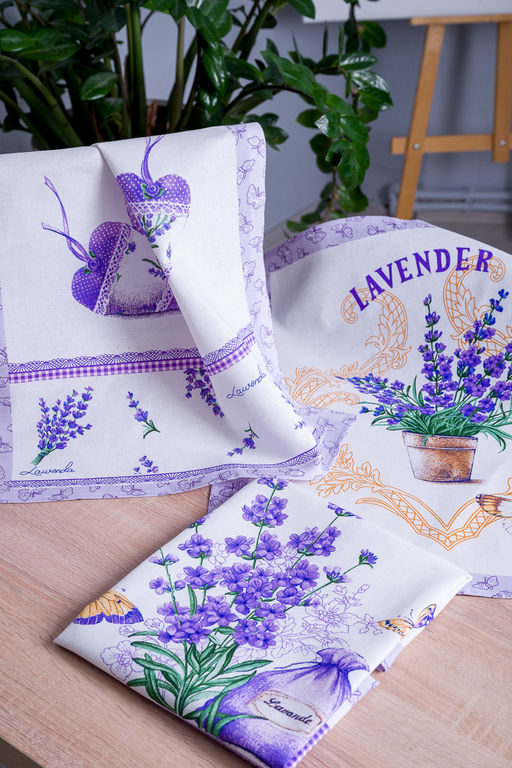 Яркие лавандовые узоры отлична гармонируют на белом фоне полотенец. В наборе три полотенца размером 60*48см у каждого из них индивидуальный рисунок. Набор полотенец будет отлично гармонировать с одноименной скатертью "Сиреневая дымка", она продается отдельно.