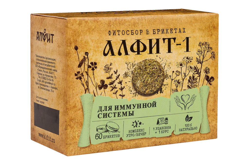 2 брикета (1 брикет утром (Алфит-1 утренний), 1 брикет вечером (Алфит-1 вечерний)). Комплект рассчитан на 1 месяц приема.