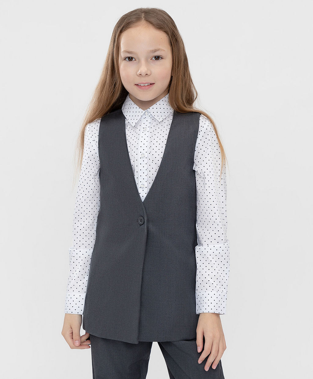 Жилет - основа базового гардероба школьника. Удобный и современный крой - все, что нужно для идеального образа. Материал легок в уходе, не мнется при носке. Удлиненная модель с застежкой на одну пуговицу. Пояс на спине поможет подобрать идеальную посадку модели.