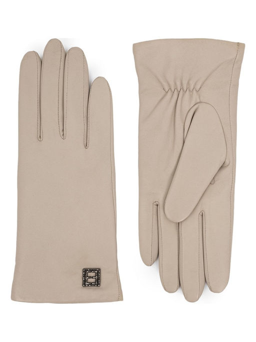 Перчатки женские торговой марки ELEGANZZA. Выполнены из высококачественной натуральной кожи ягненка в актуальном цвете сезона и дополнены подкладом из мягкой шерсти. Украшены фурнитурой из цветных кристаллов в форме символики бренда. Модель со средней длиной пальцев и длиной манжеты от нижней точки большого пальца до края перчаток - 6 см.­