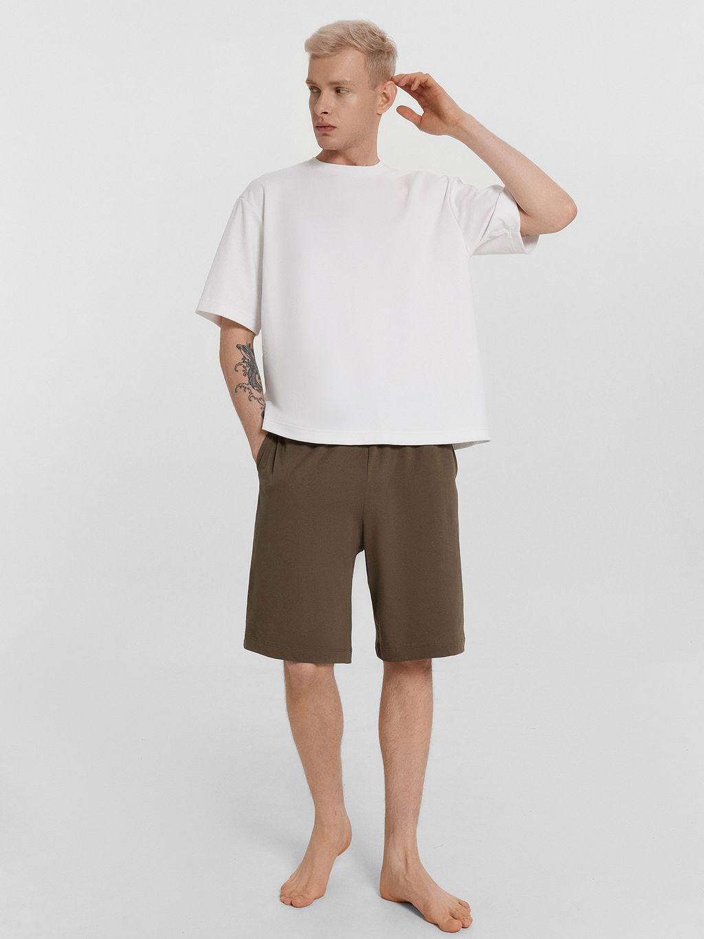 Мужские домашние шорты удобный и практичный вариант для комфортного отдыха. Прямой крой обеспечивает свободу движений, а эластичный пояс на кулиске позволяет регулировать посадку, обеспечивая удобство при носке. Боковые карманы добавляют функциональности, позволяя удобно хранить небольшие вещи. Нижние срезы изделия обработаны швом вподгибку, что придает аккуратный вид. Выполненные из хлопковой кулирки, шорты отличаются мягкостью, воздухопроницаемостью и приятными тактильными характеристиками, обеспечивая комфорт на протяжении всего дня. Отличный выбор для домашнего отдыха, сна или расслабленных повседневных образов!­