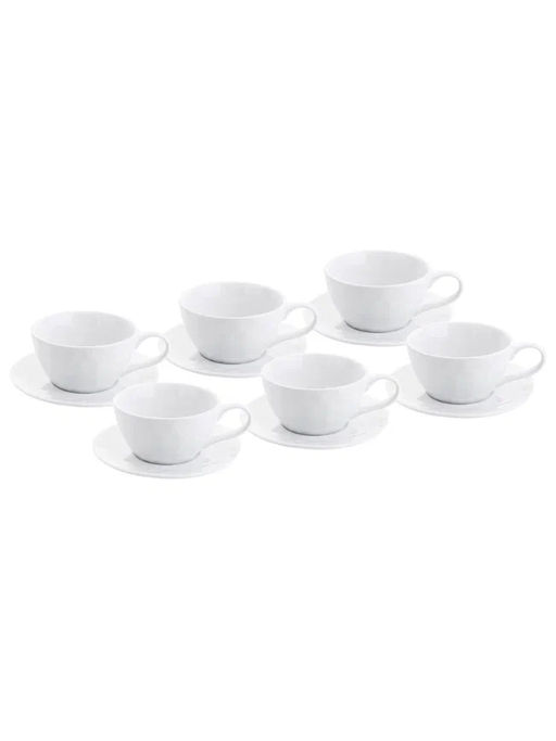 Спеццена Толщина стенок 1.5 -2 мм. Комплектация: 6 чашек д. 11х5,7 см (250 мл), 6 блюдец д. 15.2х1,9 см с фирменным логотипом. Материал: толстостенный турецкий фарфор. Можно использовать в СВЧ и мыть в посудомоечной машине. Цвет: белый.