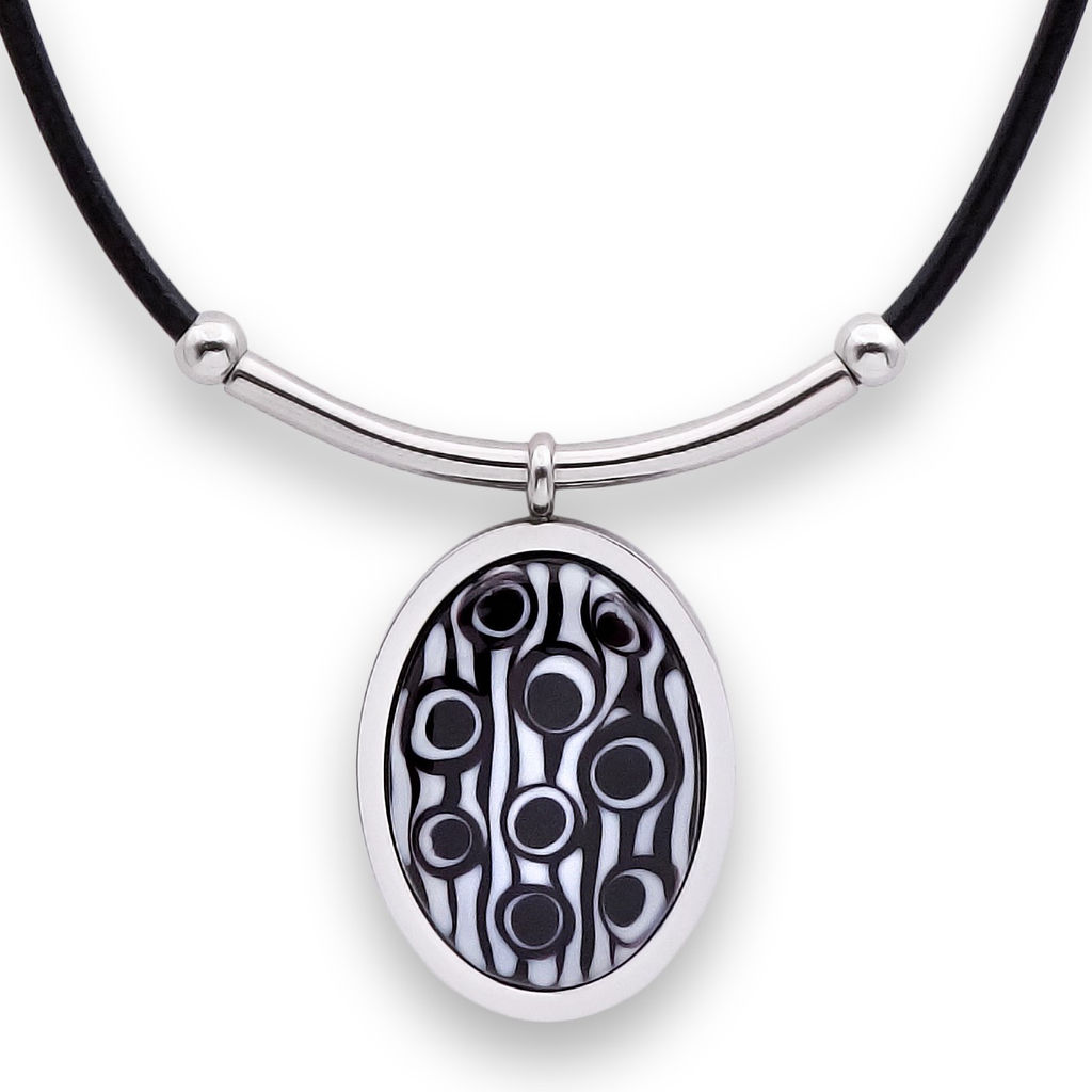 Колье изготовлено из натуральной кожи, муранского стекла и гипоаллергенной ювелирной стали, что очень важно для людей с чувствительной кожей. Металл не темнеет и не подвергается воздействиям окружающей среды, надолго обеспечивая красивый внешний вид изделия. Длина колье - 46 см + 5 см. удлиняющая цепочка. Размер стеклянного элемента - 4х3 см. Вес - 25 гр.­