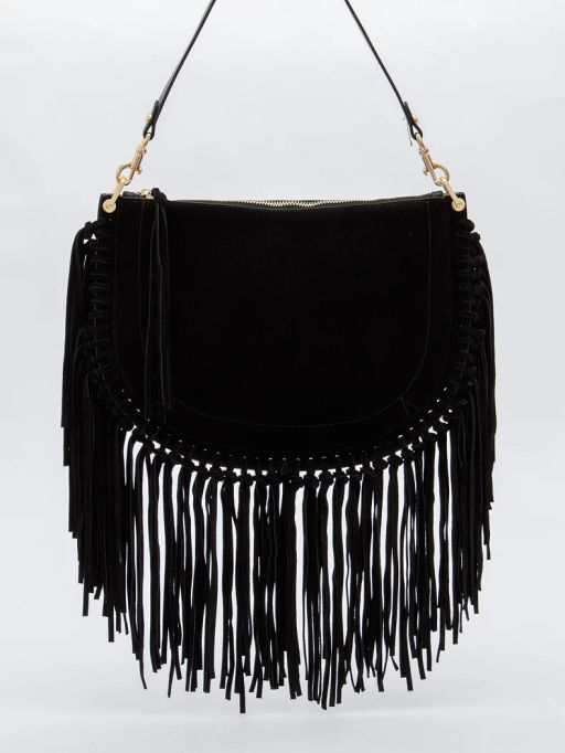 Эффектная модель, выполнена из замши. Декорирована бахромой. Дополнена золотистой фурнитурой. Данная модель закрывается на молнию Каркас мягкий. Носится в руке за съемную удлиненную ручку или на плече. В комплекте имеется съемный ремень с регулировкой длины.
