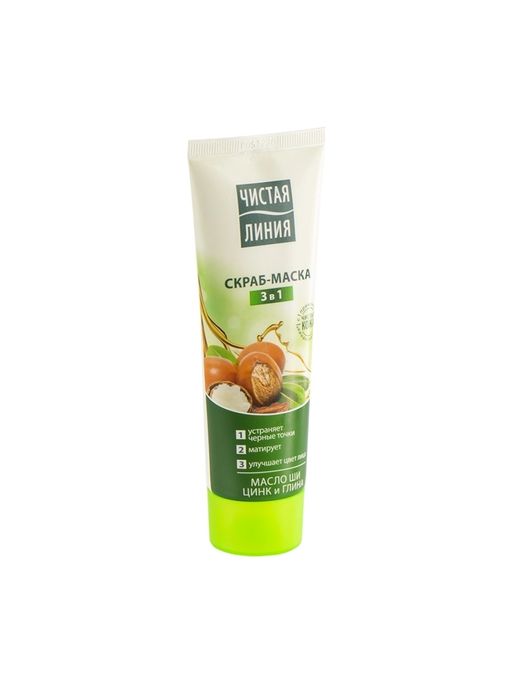 Скраб-маска для лица Чистая линия - это многофункциональное средство для ухода за кожей! Маска-скраб с мягкими частичками подходит в качестве скраба для деликатного отшелушивания ороговевших клеток кожи. Можно сделать маску для лица: нанести средство на влажную и очищенную кожу на 3-5 минут, а затем смыть. Скраб-маска способствует очищению пор и устранению жирного блеска. Содержит масло ши, цинк и глину. Маска 3в1 подходит для нормальной, чувствительной и коминированной кожи.