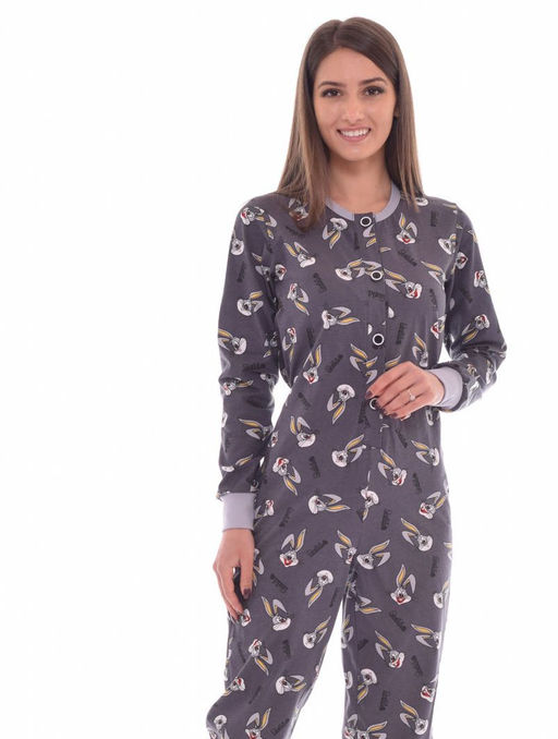 Пижама женская - комбинезон из кулирки.Полукруглая горловина с декоративной отделкой, рукав длиный на манжете.Низ комбинезона на манжете. На спинке по поясу вставлена резинка.По переду принт - пуговицы. Длина изделия 50 размера: длина от плеча до талии 44 см, длина от талии до низа - 106 см, длина по шаговому шву - 78 см. Состав: 100%-хлопок. Состав отделки: 95%-хлопок, 5%-ПЭ.