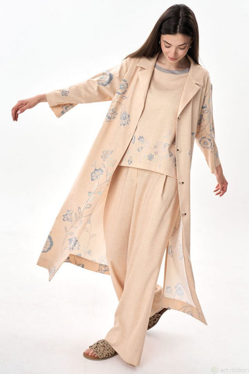 Кардиган промого силуэта с карманами в боковых швах и разрезами. Рукав втачной, воротник пиджачного типа. Возможно незначительное отличие цвета изделия из-за цветопередачи монитора.