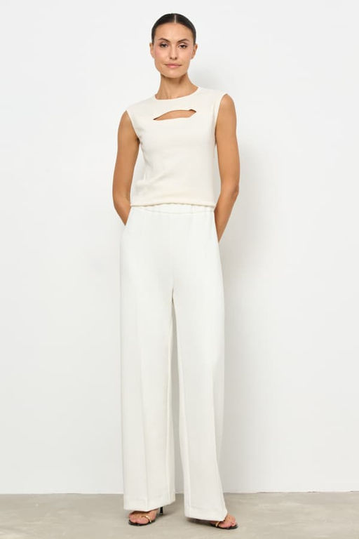 Брюки из эластичного полотна прямого силуэта. На передней части брюк застрочены стрелки. Пояс с эластичной резиной.
