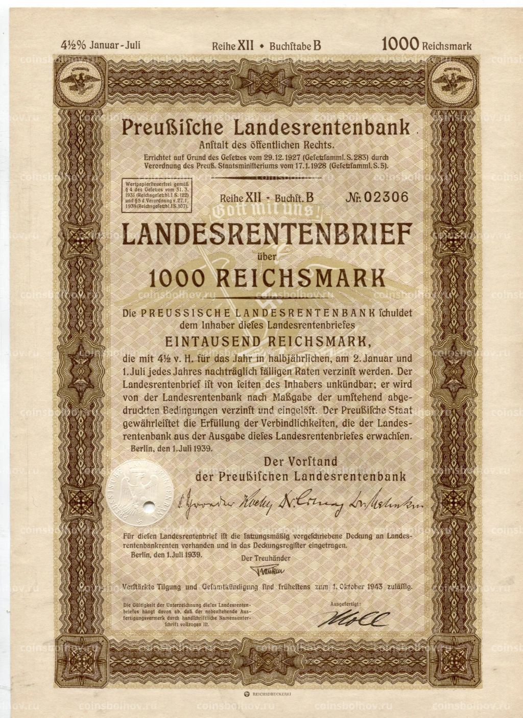 Облигация 4,5% 1000 рейхсмарок 1939 года Германия