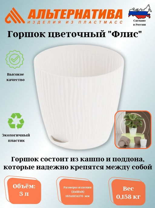 Горшок состоит из кашпо и поддона, которые надежно крепятся между собой. Горшок оснащен дренажной решеткой и специальным носиком, с помощью которого производится прикорневой полив. Такая система полива создает вентиляцию в корневой системе растения, а также позволяет выходить лишней влаге из почвы. Рифлёный рисунок имитирует рельефную текстуру традиционной керамики ручной работы. Волнистая поверхность сохраняет свою форму как с внешней, так и с внутренней стороны горшка. Горшок Флис не только привлекает своим стильным и современным дизайном, но также поддерживает оптимальный уровень влаги в корне растения. Благодаря этой системе, вы можете заботиться о своем растении и наслаждаться его красотой без лишних хлопот. Вес 0.158 кг Размеры изделия (ДхШхВ) 185х185х170 мм -- Характеристики -- Артикул: М8443 Кол-во в заводской упаковке: 14 Кол-во в упаковке: 14 Литраж: 3,0 л. Материал: Пластмасса Торговая марка: АЛЬТЕРНАТИВА Индивидуальная упаковка: Нет Размер изделия- длина, ширина, высота (см): 18*20*20 Размер упаковки- длина, ширина, высота (см): 18*20*20 Страна Производитель: Россия