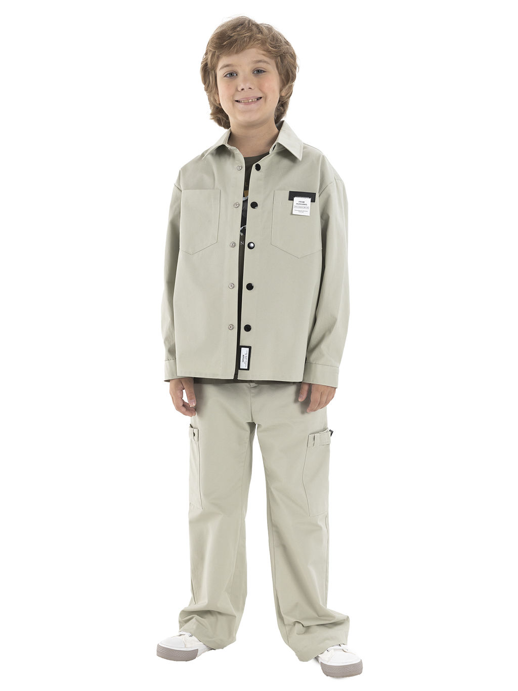 Куртка-джинсовка из плотного хлопка с застежкой на кнопки, спущенное плечо, длинные двухшовные рукава, с притачными манжетами, складкой и застежкой на кнопку, воротник на стойке, на полочках накладные карманы, на левом кармане и планке нашивки, на спинке кокетка с встречной складкой.