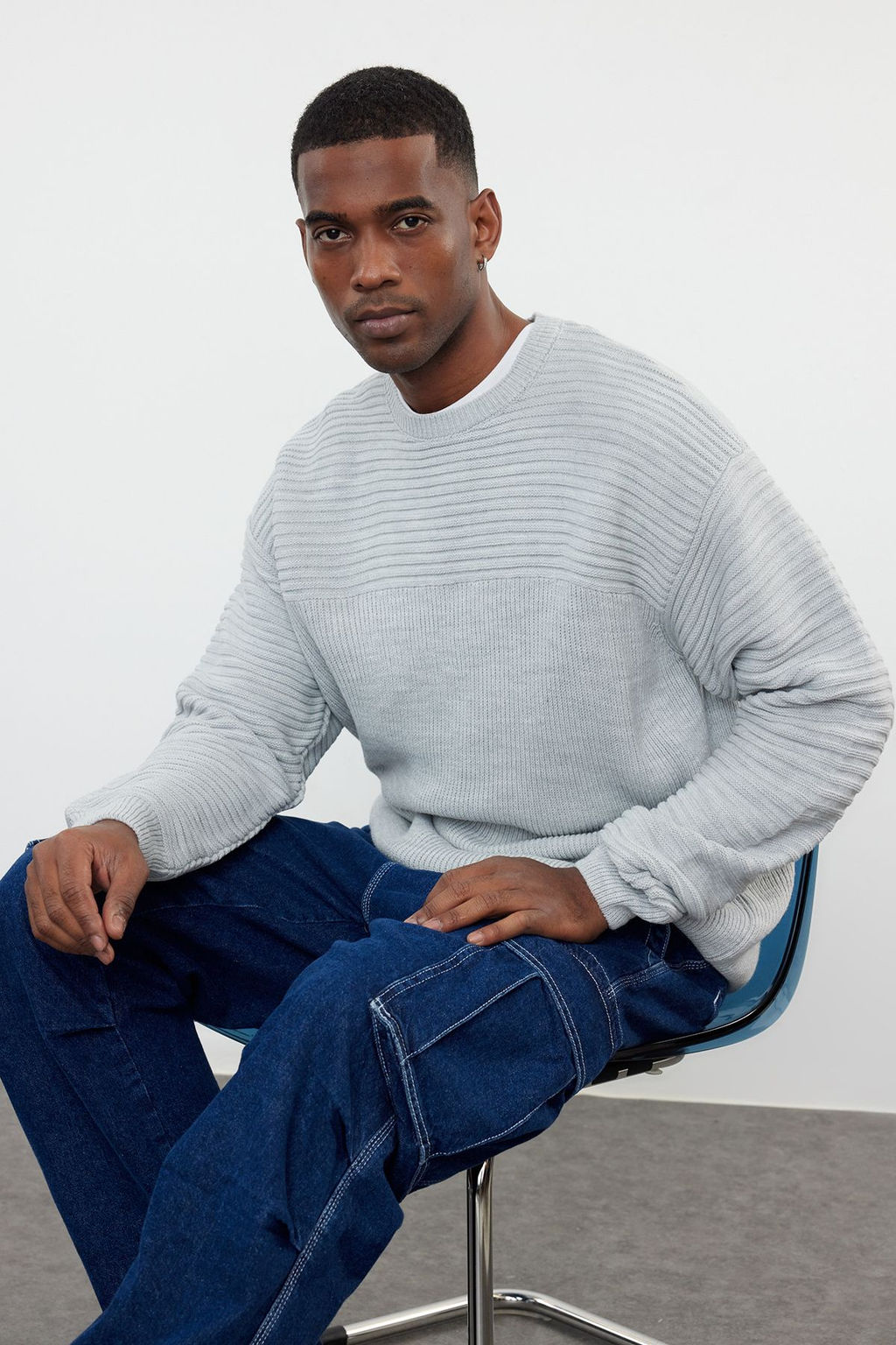 Gri Unisex Oversize Bisiklet Yaka Duz Triko Kazak TMNAW25KZ00004