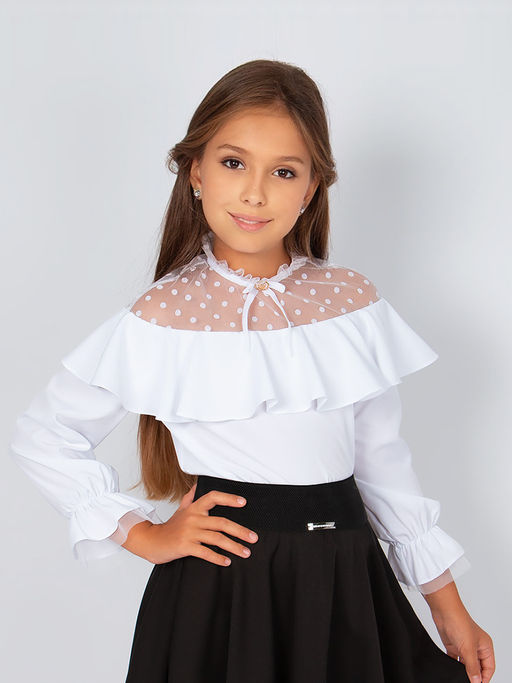 Блузка свободного силуэта, украшенная пышным воланом. Основная ткань - воздушный шифон, верхняя часть выполнена из фатина с флоковым декором в виде горошков, воротник украшен бархатной лентой, декоративные элементы включают блестящую фурнитуру со стразами, потайная молния на спине для удобства надевания, низ рукава на мягкой эластичной резинке. Блузка прекрасно подойдёт как для повседневной школьной носки, так и для праздничных мероприятий.