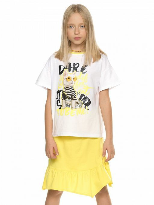 Комплект для девочек футболка и юбка. Футболка актуального мягкого оверсайз силуэта со спущенным плечом. Фотопринт и текстовый неоНовый принт с серебряным металликом и глиттером, перевод Осмелься быть другой. Это круто быть мной.. Юбка Новинка. Умеренный объем, по низу юбки пришит фигурный волан. Пояс на комфортной внутренней резинке.