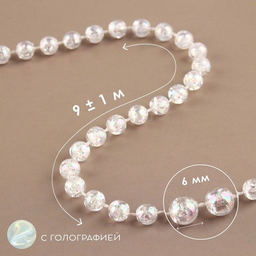 • Бусы на нитях, с голографией, 6 мм, 9±1 м, прозрачные