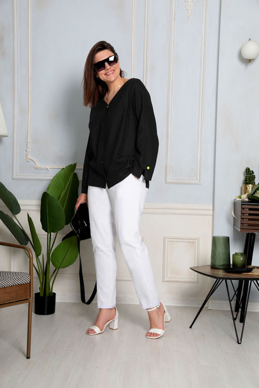 Брюки классические, повседневно-нарядного стиля, полуприлегающего силуэта. Выполнены из джинсовой, хлопковой текстильной ткани со стрейчем. Пояс притачной, частично на эластичной резинке. Передняя часть разрезная, которая создаёт эффект стрелки и зрительно удлиняет ножки. Брючки имеют хорошую посадку за счёт отрезной кокетки по задней части. В боковых швах карманы с отрезным бочком.