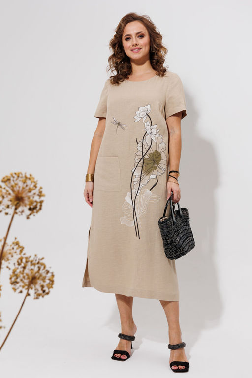 Платье женское слегка расклешённое к низу, льняное. На переде расположена декоративная печать. Нагрудная вытачка идёт с боковых швов. На правой половине расположен накладной карман. Спинка со средним швом, в котором расположена застёжка горловины на одну пуговицу. Горловина круглой формы. По боковым швам имеются разрезы. Рукава короткие, одношовные.