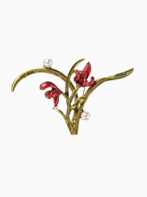 • Брошь «Цветы» ирисы, жемчуг, цвет красно-зелёный