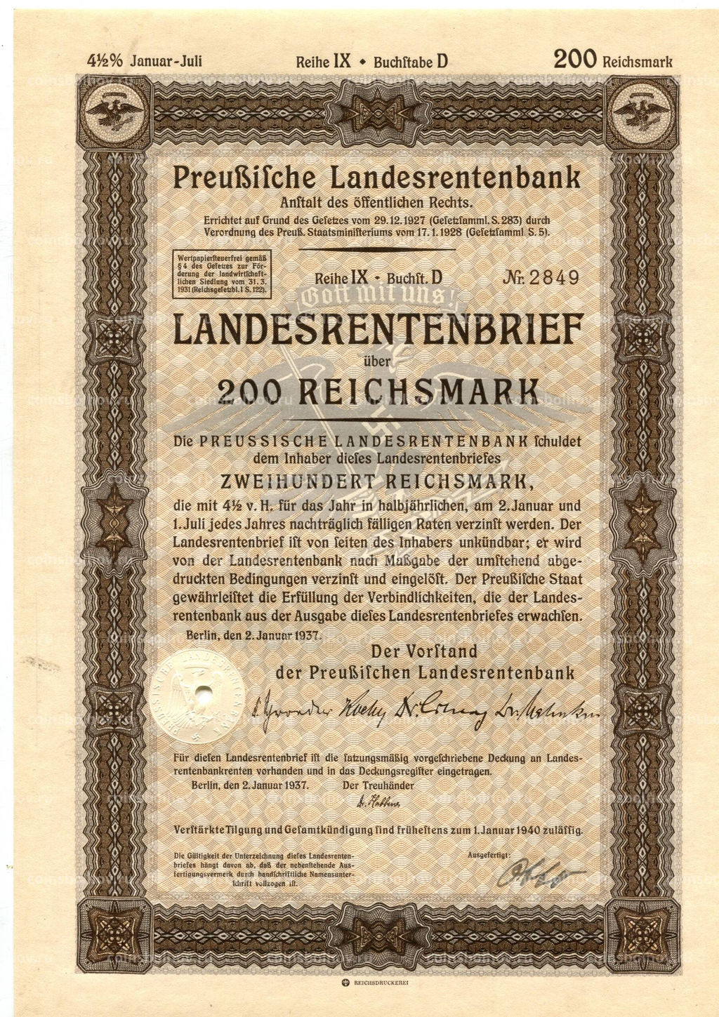 • Облигация 4,5% 200 рейхсмарок 1937 года Германия
