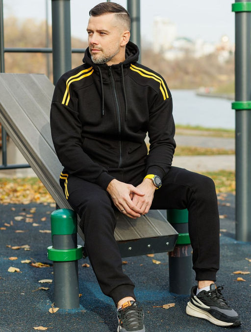 Верх — толстовка на молнии с капюшоном и со спущенной линией плеча. Яркие лампасы по рукавам и капюшону добавляют выразительности и создают спортивный акцент. Боковые карманы на молнии оформлены отделкой в цвет лампасов. Манжеты по низу и на рукавах делают посадку комфортной.