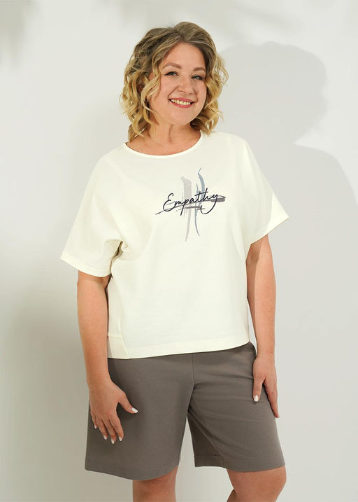 Джемпер свободного кроя из трикотажного полотна пике. Округлая горловина с внутренней окантовокй. Короткий цельнокроенный рукав. Сзади средний шов. По низу спинки изделия притачной манжет. Спереди принт.