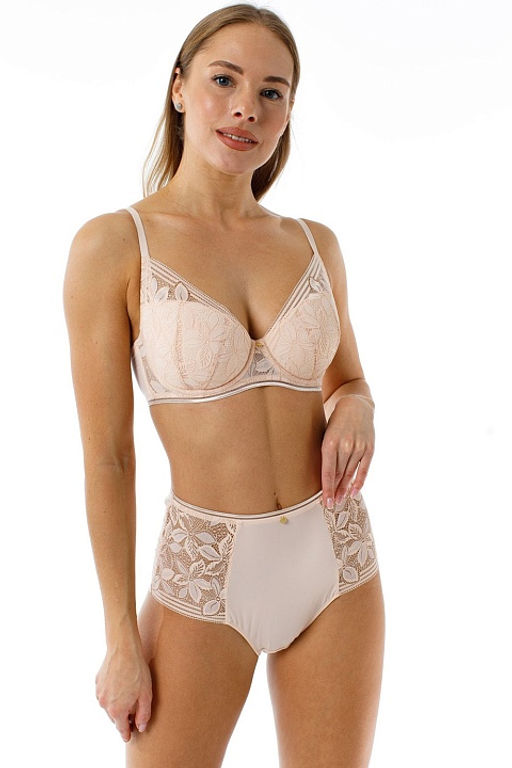 Бюстгальтер на поролоне на каркасах. Идеально приподнимает и поддерживает грудь, создавая красивую зону декольте. Выполнен из эластичного кружева и эластичного полотна. Внутри чашка продублированна хлопком. На стане бюстгальтера вертикальные упругие, корректирующие пластины, позволяющие прилегать к телу и не скручиваться боковой части бюстгальтера. Украшение: медальон с логотипом COQUETTE REVUE.­