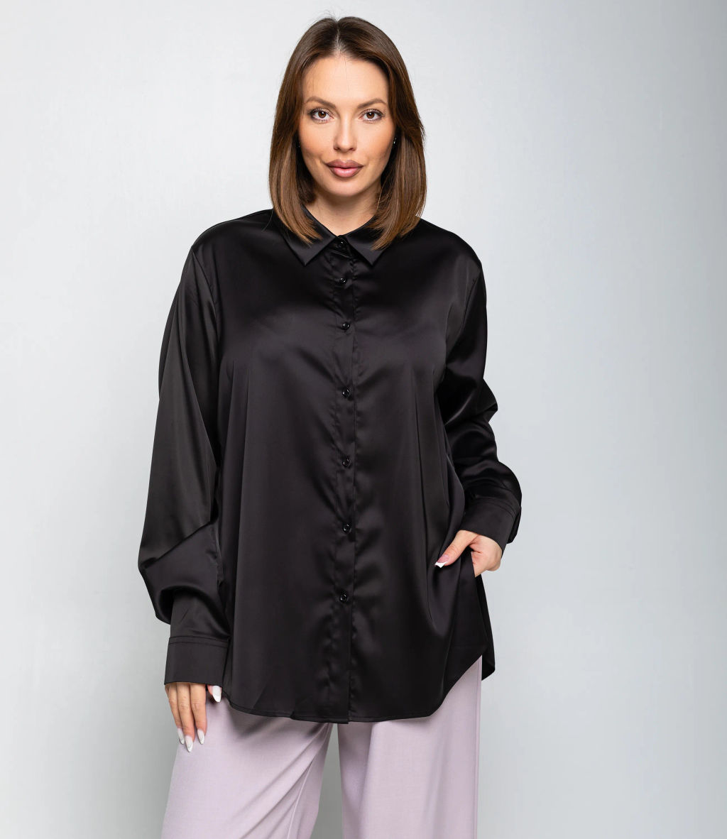 Рубашка это часть гардероба, которая подчёркивает привлекательность и индивидуальность любой женщины. Рубашка прямого свободного кроя, слегка удлинённая, с классическим отложным воротником и центральной планкой на пуговицах; втачные длинные рукава с прямоугольными манжетами на пуговицу, округлённый нижний край с удлинением по спинке и боковыми разрезами для удобства движения, отсутствие нагрудных карманов подчёркивает минималистичную линию; лёгкий гладкий материал средней плотности с мягкой драпировкой и небольшим блеском, аккуратно обработанные швы и скрытая строчка на планке, прочные закрепки в зонах нагрузки, посадка с запасом в области плеч и груди для расслабленного, но аккуратного силуэта, универсальная базовая модель для деловых и повседневных образов. Для пошива использована ткань: 95% полиэстер, 5% спандекс. Мы предлагаем выгодные оптовые условия, гибкую ценовую политику и надёжные поставки для магазинов. Установленная цена адекватна и позволит вам формировать привлекательную наценку и обеспечивать высокую оборотность. Предложите своим покупательницам рубашку, сочетающую комфорт, качество и повседневную элегантность. -- Характеристики -- Цвет: черный Пол: Женский Страна производитель: Китай Сезон: Демисезон Материал: Полиэстер, Спандекс