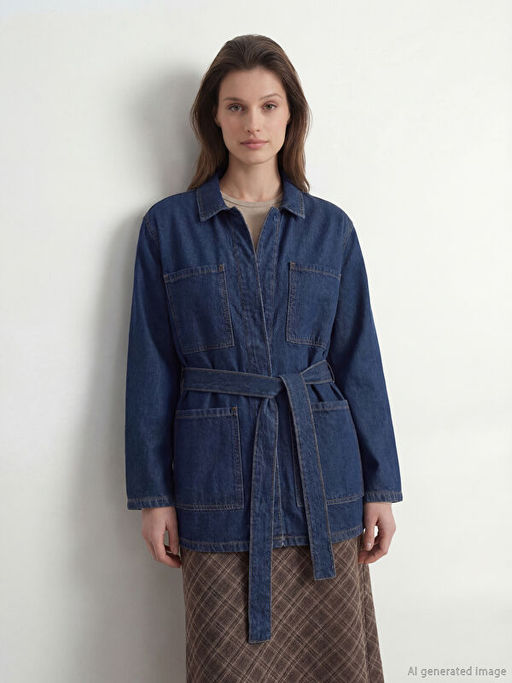 G?mlek Yaka Beli Ku?akl? Kad?n Jean Ceket