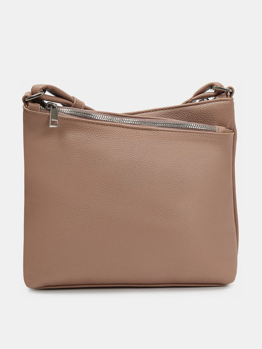 Сумка женская из экокожи с зернистой фактурой. Два основных отделения закрываются на молнии, среднее разделительное на магнитную кнопку. Снаружи на тыльной стороне есть карман для денег и документов. Носить сумку можно на одном плече или через плечо на длинном ремне. Асимметричная форма с диагонально расположенными молниями делает модель интересной. Сумка цвета капучино дополнит повседневные образы в стиле casual.