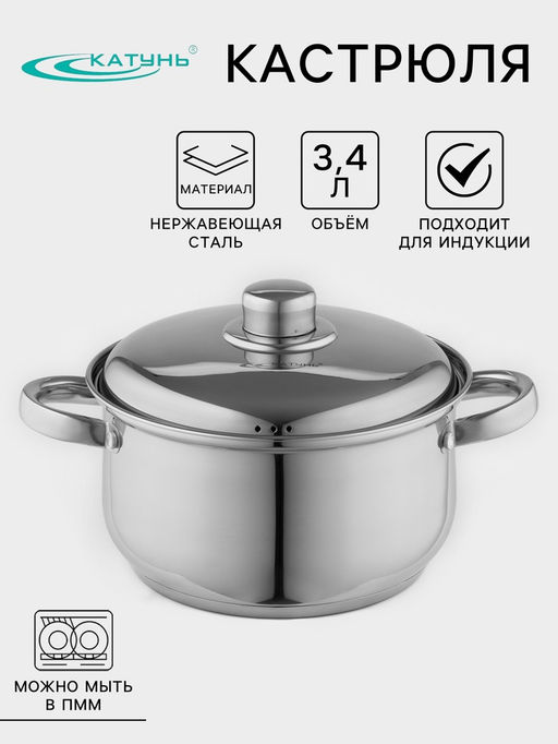 Кастрюля Катунь «Гретта», 3.4 л, d=20 см, капсульное дно, индукция, нержавеющая сталь, AISI - 201