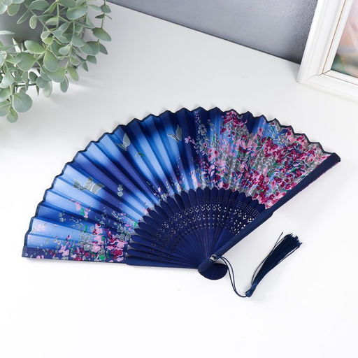 • Веер складной h=21 см Цветы и бабочки, синий, с кисточкой