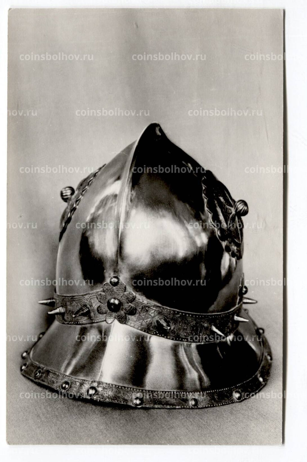 Открытка Эрмитаж Рыцарский зал. Боевой шлем Салад XVI век. Испания