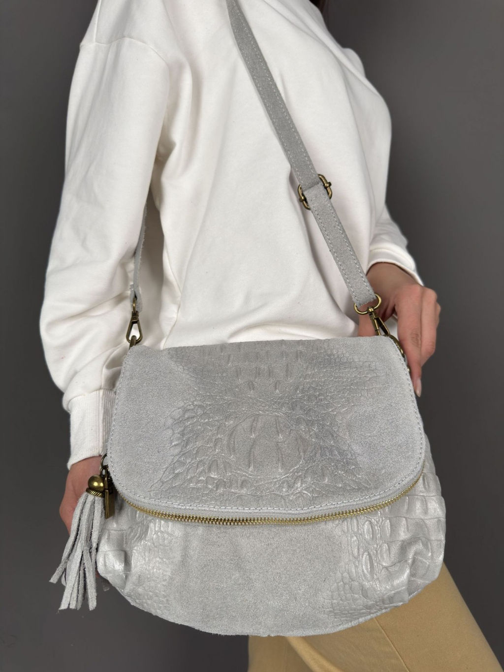 Страна: Италия Тип товара: Сумки Тип кожи: Телячья Тип: Женские Производитель: Pelletteria Luisa, Italy Размер: средняя Стиль ношения: на ремешке через плечо Форма: мягкая Выделка кожи: замшевая под крокодила Цвет кожи: Серый Оттенок: светло-серый Упаковка: Пакет тканевый L, 40x40 см Палитра цветов: TB-39 Caimano На складе: есть Размеры: длина: 30 см \tвысота: 23 см \tширина: 6 см Описание: Красивая и удобная женская сумка из натуральной кожи, производство Италия. Базовая коллекция, ХИТ Sefaro. Шикарная выделка кожи, замшевая с тиснением под крокодила, мягкая форма и оригинальная крупная кисть на молнии придают сумочке вид раритетной и антикварной вещи. Функциональность этой модели на высоте: довольно объемистое при компактных размерах основное отделение уместит все самое необходимое, регулируемый плечевой ремень позволит подобрать комфортную длину. Сама сумочка в целом яркая, эффектная, выполненная в самых разных фактурах кожи и цветовых решениях, как нельзя лучше подойдет энергичной красавице, стремящейся каждый день быть в трех-четырех местах одновременно. Модель сочетается с вещами в стиле Casual, будет органично смотреться в классическом, деловом, винтажном либо повседневном образах. Закрывается внахлест на кнопку и молнию. По периметру крышки двойная молния с декоративной кисточкой из натуральной кожи. Внутри одно большое отделение и два боковых кармана, один на молнии для мелких вещей, другой из натуральной кожи для телефона. С обратной стороны карман на молнии. Качественная итальянская фурнитуре в цвете матовой бронзы. Внутренняя отделка - качественная, водоотталкивающая, приятная на ощупь и долговечная в использовании, ткань. В комплекте имеется кожаный ремешок для ношения через плечо, длиной 120см, регулируется по длине - стильно, удобно и практично!