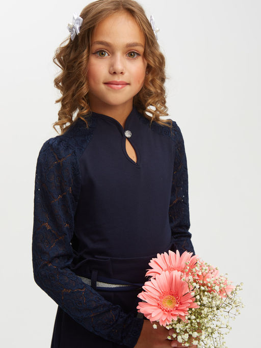 Блуза трикотажная с длинными рукавами, присборенными по окату, цельнокроеный воротник-стойка. Рукава, кокетка из кружевного полотна. Состав:72% х/б, 20% п/э, 8% лайкра