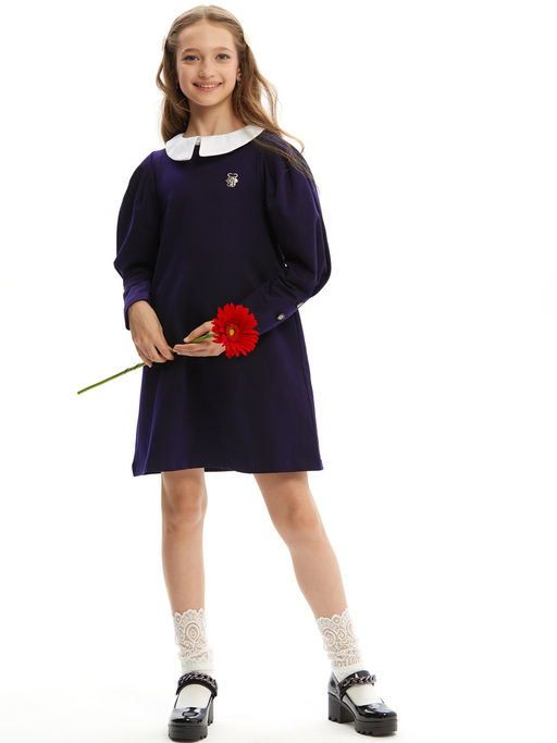 Платье трапециавидного силуэта из футера 2-х нитки с лайкрой.Воротник съемный из текстиля контрастного цвета. Рукав-фонарик длинный, зауженный к низу. На спинке вырез-капелька, застегивается на одну пуговицу. Состав:92% хлопок, 8% лайкра