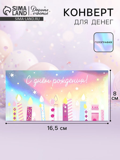 • Цена за 5 шт. Конверт для денег «С днём рождения», голография, торт, 16.5×8 см