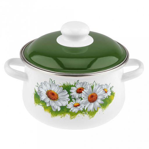 • "Ромашки лето" Кастрюля эмалированная 2л, д17см, h12,5см, коническая форма, металлическая крышка, ободок из нержавеющей стали, белый (Россия)