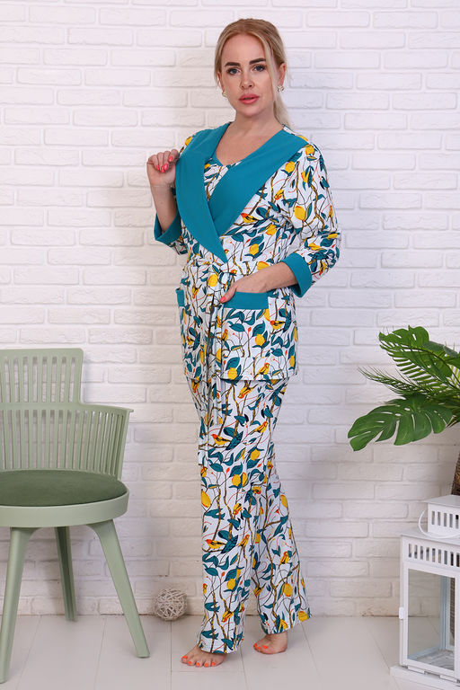 Женский комплект из кулирки - халат, топ и брюки. Халат с воротником "шаль", накладные карманы, рукава чуть ниже локтей. Майка с отрезной кокеткой, брюки прямые, на резинке