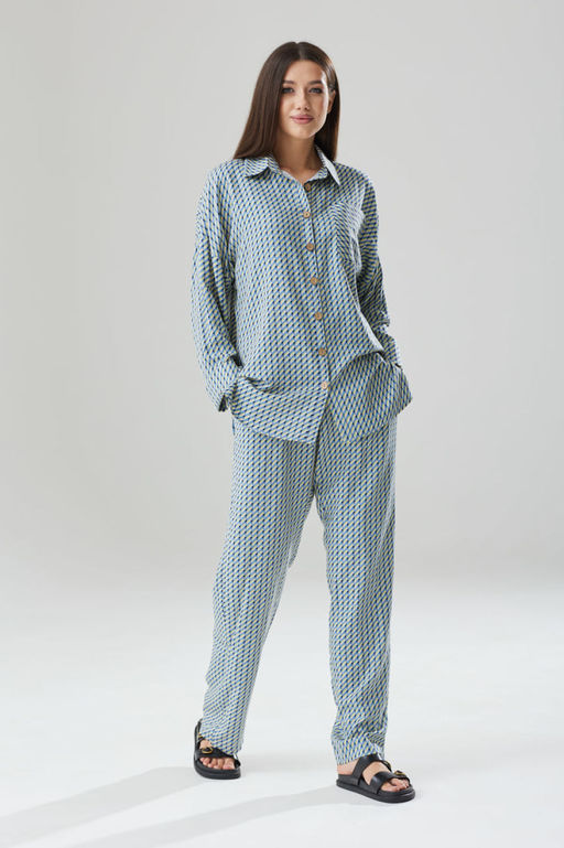 Состав: Вискоза-100%; Стильный комплект, состоящий из блузы рубашечного силуэта и свободных брюк. Блуза прямого свободного силуэта с рубашечным воротником на стойке, спущенной линии плеча и втачным рукавом на манжете с отворотом. В боковых швах расположены открытые разрезы, высотой 11 см. На левой стороне полочки находится накладной карман. Застежка петли-пуговицы расположена на фронтальной вертикальной планке. Длина изделия по спинке-73 см. Длина рукава от плечевой точки горловины-61 см(положение манжеты с отворотом). Брюки комплекта прямого силуэта. В боковых швах расположены внутренние наклонные карманы. Пояс со вставленной эластичной тесьмой, шириной 3 см. и дополнительным шнуром-кулисой для четкой фиксации объема талии. Длина брюк по боковому шву-112 см * фурнитура может отличаться от представленной на рекламном фотоматериале) Особые рекомендации: рекомендуется холодная деликатная ручная стирка, без использования отбеливающих СМС, без интенсивного трения. Сушка в вертикальном положении. ВТО с минимальным паром. -- Характеристики -- Состав: Вискоза-100%; Сезон: Осень-Зима Рост: 164 Страна бренда: Беларусь
