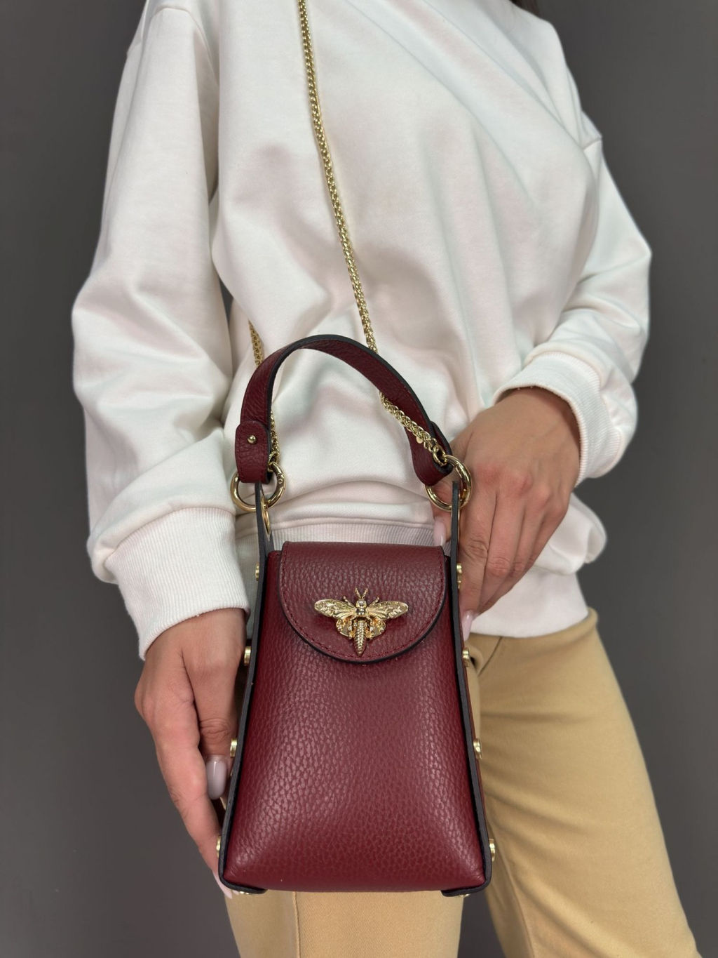 Страна: Италия Акции: Товары со скидкой Производитель: Pelletteria Luisa, Italy Размер: маленькая Стиль ношения: на ремешке через плечо Форма: жесткая Выделка кожи: зернистая износостойкая Цвет кожи: Бордовый Оттенок: светло-бордовый Упаковка: Пакет тканевый L, 40x40 см Палитра цветов: TB-105944 Dollaro Размеры: длина: 13 см \tвысота: 21 см \tширина: 6 см Описание: Красивая аккуратная необыкновенно модная женская сумка кросс-боди из натуральной кожи. Италия. Особенности сумки: замок в виде золотой бабочки, плечевой ремень-цепочка, а также заклепки на боковых стенках сумки - фурнитура высокого итальянского качества. Все эти элементы непременно привлекут к вам внимание окружающих своей яркостью и оригинальностью исполнения. Сумочка имеет каркасную форму, компактная, выполнена из зернистой телячьей кожи, может использоваться как повседневная модель, но подойдет и для торжественного случая - элегантно дополнит вечерний образ по типу клатча, либо подчеркнет сдержанный лук. Закрывается сумка на крышку, внутри один отдел, в котором поместится всё самое необходимое. На дне сумки металлические защитные ножки. Можно носить в руке, либо на изящной цепочке через плечо - очень удобно!