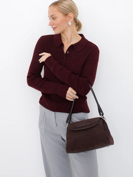 Базовая модель, выполнена из замши. Дополнена серебристой фурнитурой. Данная модель закрывается на клапан, носится в руке за съемную ручку. Или на плече, в комплекте имеется ремень с регулировкой длины. Каркас полужесткий. На дне предусмотрены ножки.