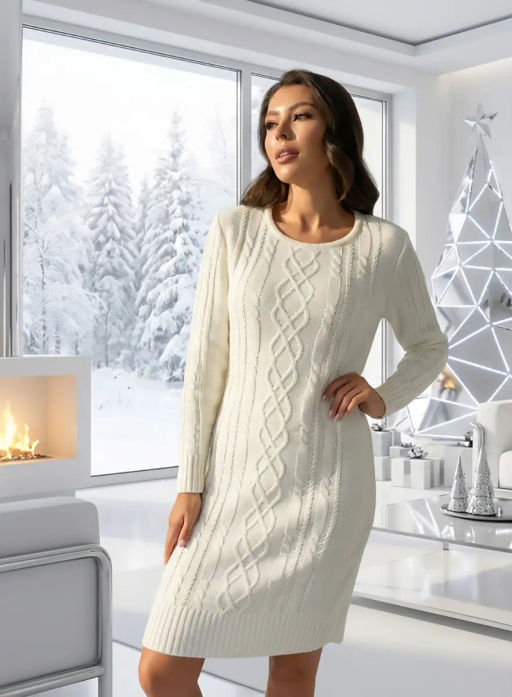 Вязаное платье женское полуприлегающего силуэта . Рукава втачные длинные. Горловина круглая, обработана бейкой.  Платье с фактурным узором  косами станет украшением вашего осеннего гардероба. Женское вязаное платье изготовлено из мягкой и приятной к телу турецкой пряжи с содержанием шерсти.и подходит для использования в зимний период.