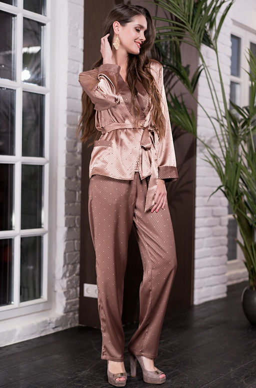 Комплект Mia-Amore состоит из 2-х предметов : блузы с длинным рукавом и брюк. Выполнен из искусственного шелка с тонким 2-х цветным жаккардовым рисунком. На блузе расположены накладные карманы, линию талии можно подчеркнуть за счет пояса. Брюки с небольшими разрезами по низу, по бокам расположены карманы. Состав:100% полиэстер