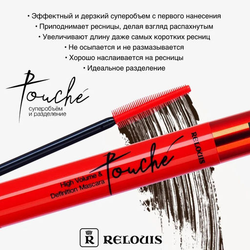 Описание товара Тушь для ресниц TOUCHE суперобъем и разделение. Бестселлер бренда Relouis! Секрет туши в уникальной силиконовой щеточке с зауженным кончиком, который позволяет равномерно распределить текстуру по ресницам, разделяя их и придавая феноменальную густоту от самых корней, не оставляя при этом комочков. Щеточка не просто наносит тушь на ресницы, но также приподнимает их, делая взгляд распахнутым, а образ еще более эффектным. Тушь для ресниц белорусская №1 среди объемных тушей Релуи. Тушь relouis touche мгновенно делает ресницы более густыми и выразительными. Благодаря насыщенной кремовой текстуре тушь легко наносится и отлично наслаивается, обеспечивая ресницам угольно-черный цвет и суперобъем. Тушь фиксирует форму ресниц на весь день, не размазывается и не осыпается. В коллекции Relouis тушь Touche есть в двух оттенках: черном и коричневом. Тушь для ресниц черная - классика, которая сделает взгляд выразительным и распахнутым. Коричневая тушь - идеальный вариант для дневного макияжа и девушек неяркой внешности: русым, блондинкам. Коричневая тушь шикарно подчеркивает голубые, серые и зеленые глаза.