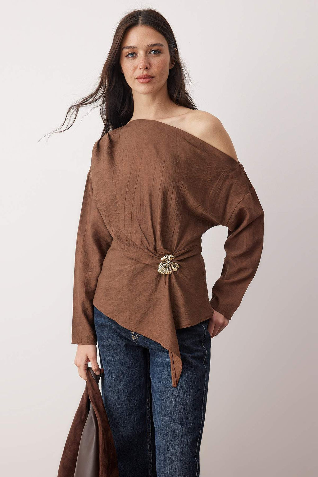 • Kahverengi Aksesuar Detayl? Dusuk Omuz Dokuma Bluz TWOAW26BZ00280