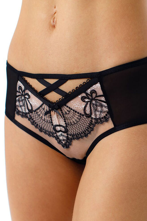 Трусы-панти со средней линией талии. Выполнены из эластичной сетки с вышивкой. Украшение: бантик и медальон с логотипом COQUETTE REVUE.­