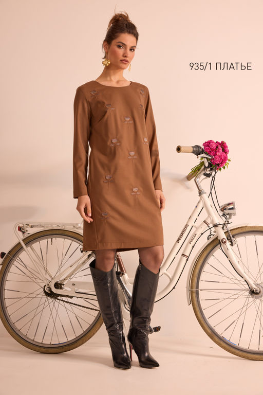 Платье прямого покроя. Модель сочетает в себе женственность и удобство. Перед декорирован дизайнерской вышивкой. Горловина переда декорирована планкой. По спинке платья складка, декорированная молнией.