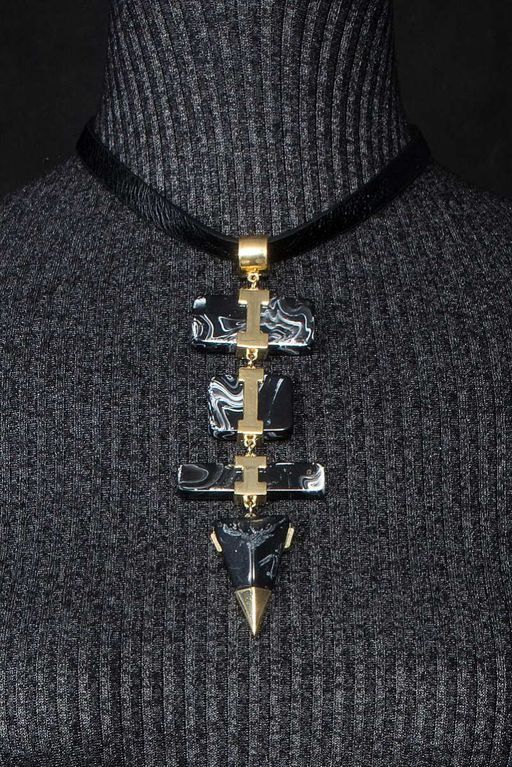 Стильный короткий подвес из пластика (имитация муранского стекла) и металла геометрической формы на кожанной тесьме. Красивый рисунок белого цвета на черных элементах создает иллюзию натурального камня.