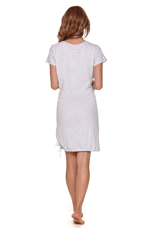 Сорочка серого цвета с надписью "Best Mom" на груди. Изделие с двумя разрезами на замочках в области горловины, по подолу проходит стягивающая резиночка со шнурочком.­
