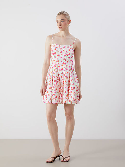 Kare Yaka ?i?ekli Modal Kar???ml? Mini Elbise